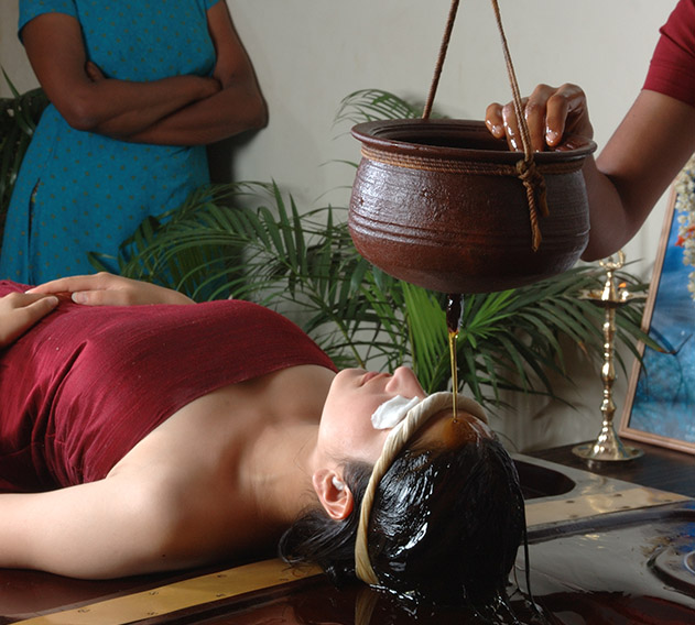 In Shirodhara, medicated warm oil/herbal decoctions/medicated milk/buttermilk is continuously poured on the forehead to induce relaxation. This therapy revitalized the central nervous system and alleviates physical/mental stress